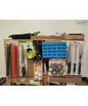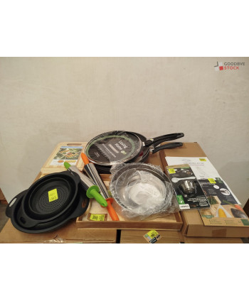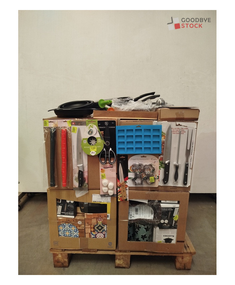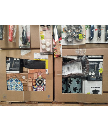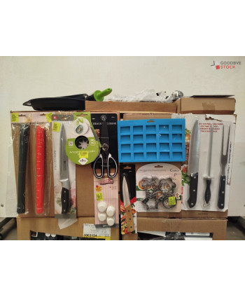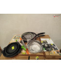 lot de 4 cartons de vaisselle et articles de cuisine comprenant: des poêles, des moules en inox, des couteaux, des ciseaux, des planches à découper, etc...