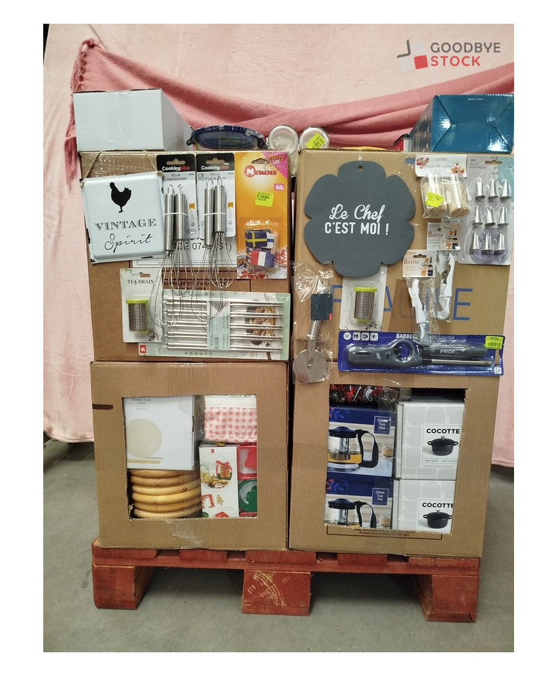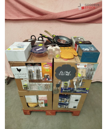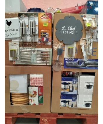 lot de 4 cartons de vaisselle et articles de cuisine comprenant: des fouets, des cure-dents, des poêles etc..
