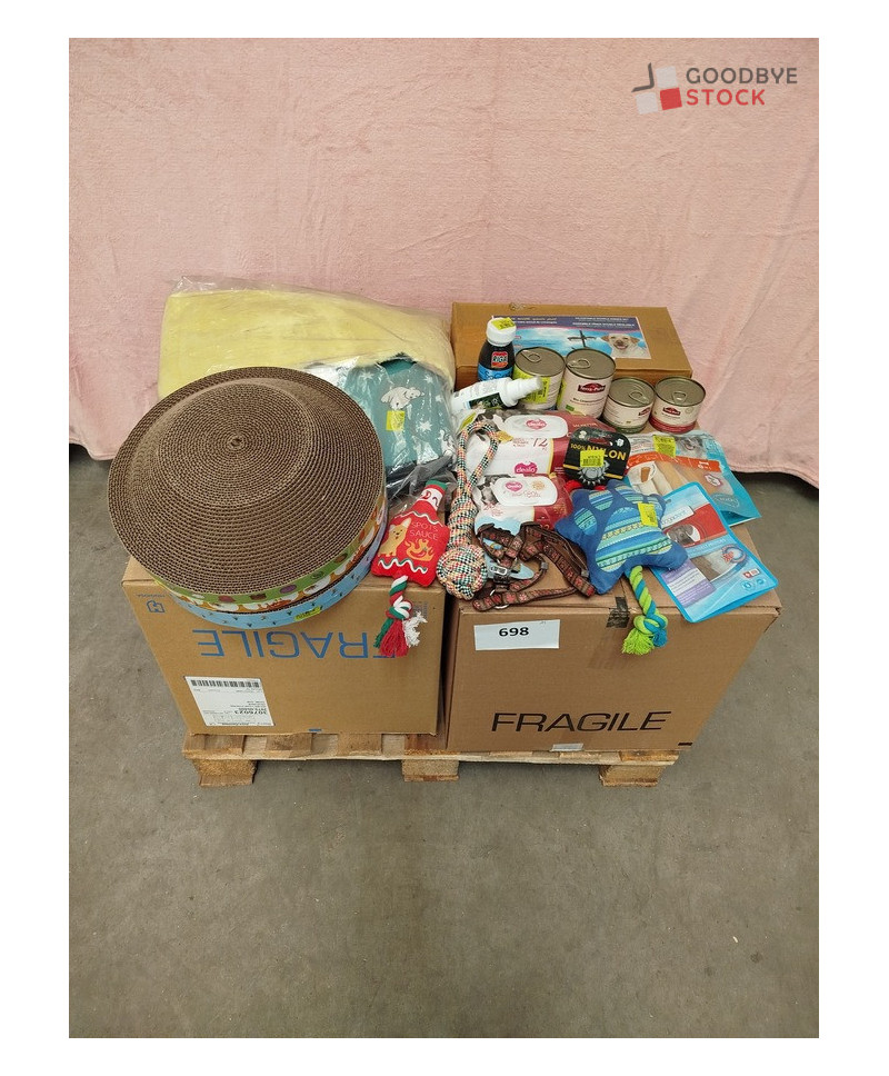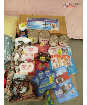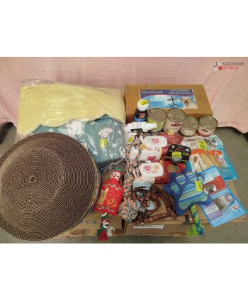 Lot de 180 articles d'animalerie comprenant: des jouets, des grattoirs, des produits d'hygiène etc..