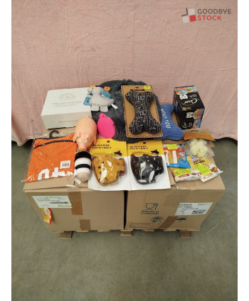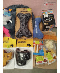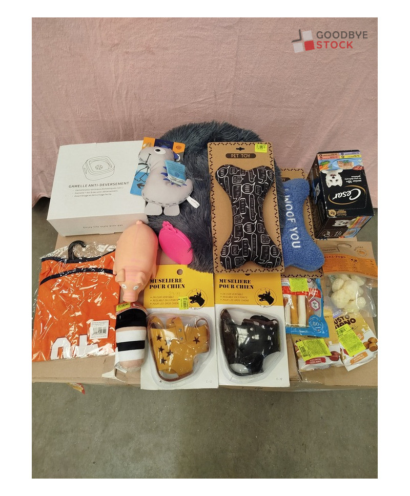Lot de 180 articles d'animalerie comprenant: des muselières, des jouets, de la nourriture, du textile, des gamelles etc..