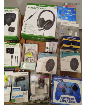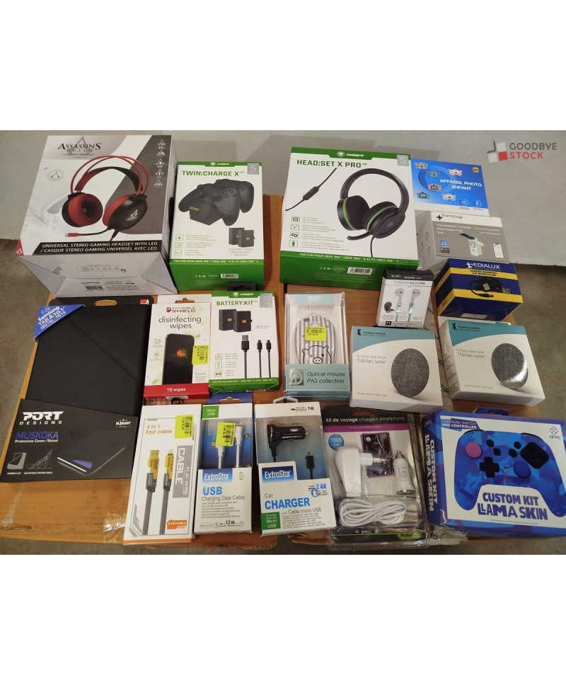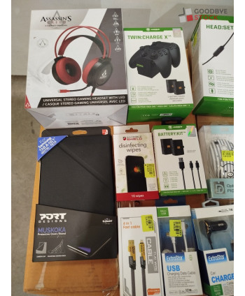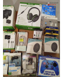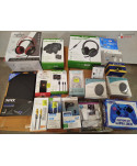 Lot d'environ 150 articles multimédia comprenant : des casques, des écouteurs, des câbles de charge, des souris, des pochettes et verres trempés...etc