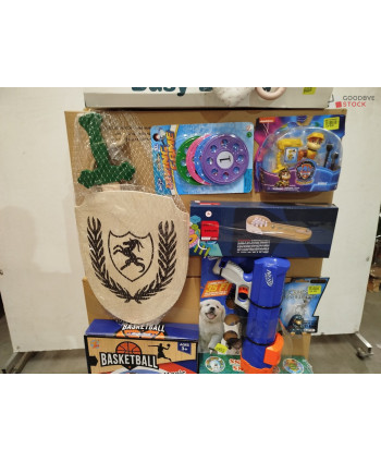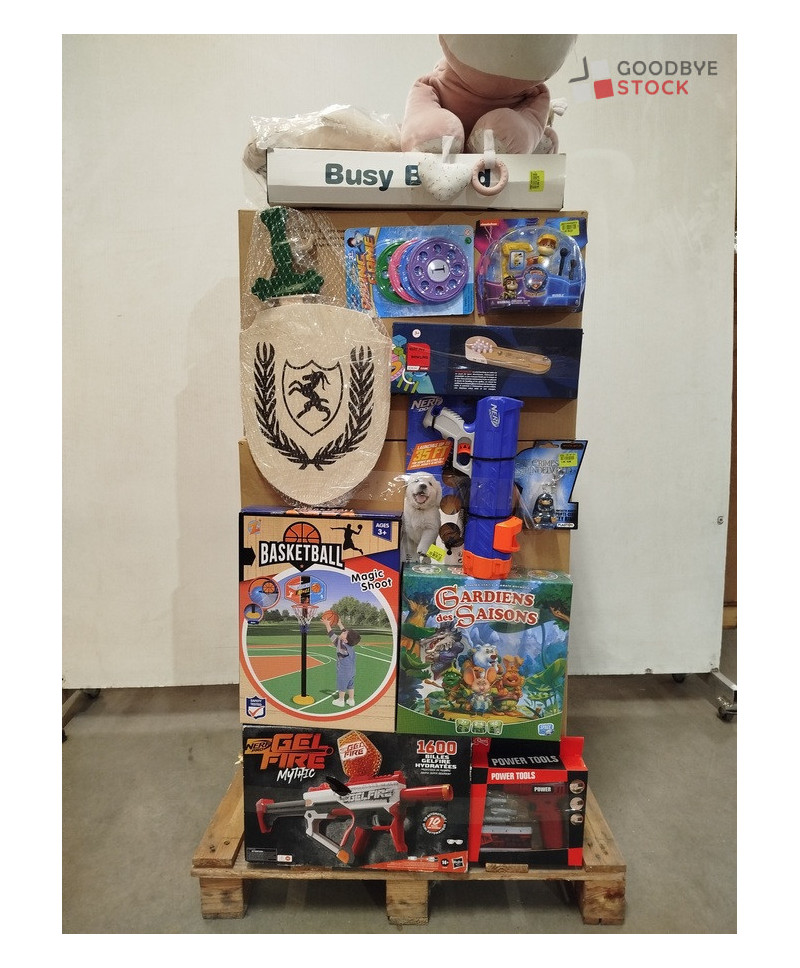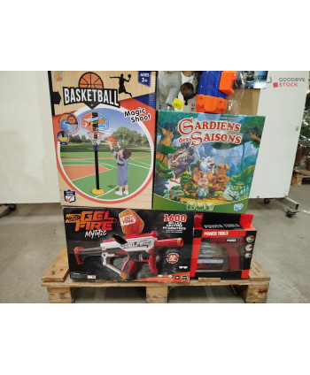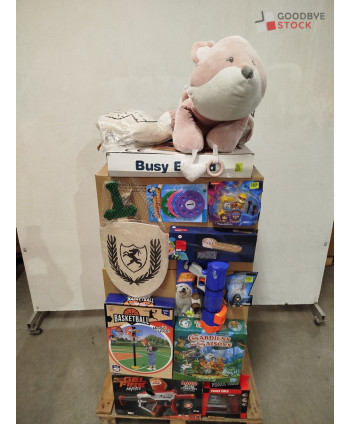 Lot de 100 jeux et jouets comprenant: des jeux d'imitation, des peluches, des pistolets NERF, des figurines...etc