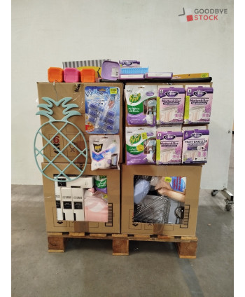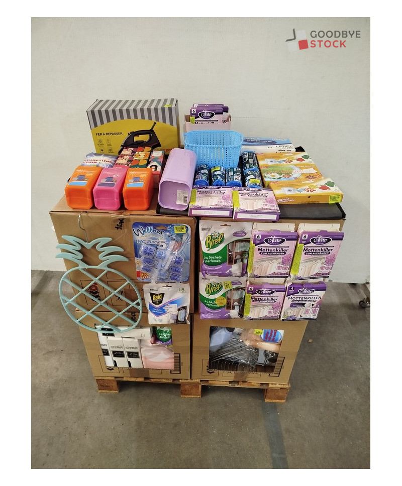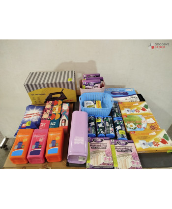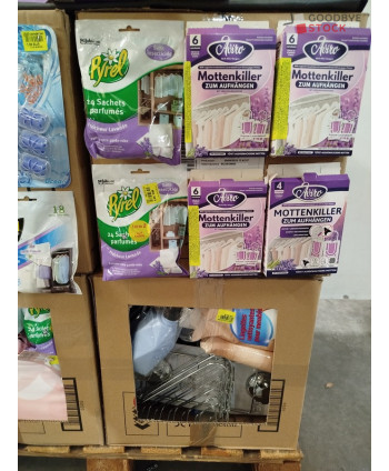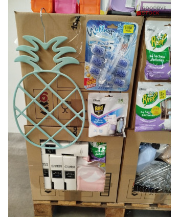 Lot de 4 cartons de produits et accessoires d'entretien ménager comprenant: des désodorisants, des blocs wc, des rouleaux de sacs poubelles, des sachets parfumés, des étagères de douche...Etc
