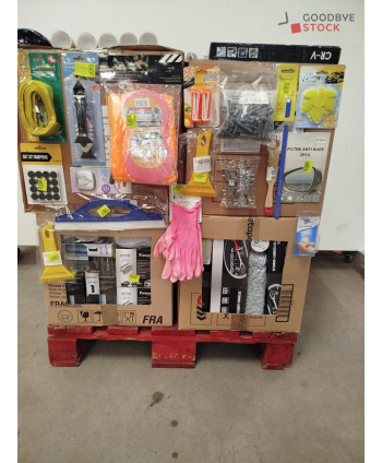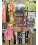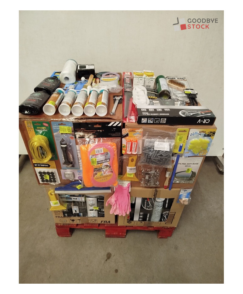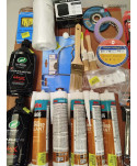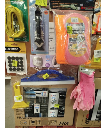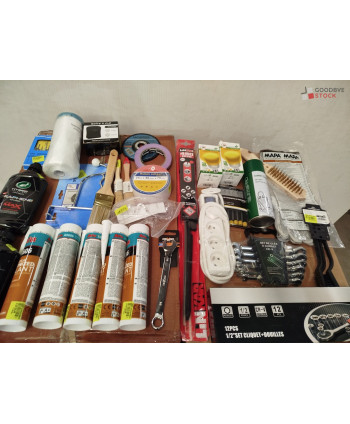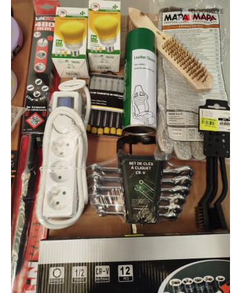 Lot de 4 cartons de bricolage comprenant : des accessoires automobiles, des gants, des chevilles, de la corde, des tubes de silicone, des pinceaux, du petit outillage...Etc