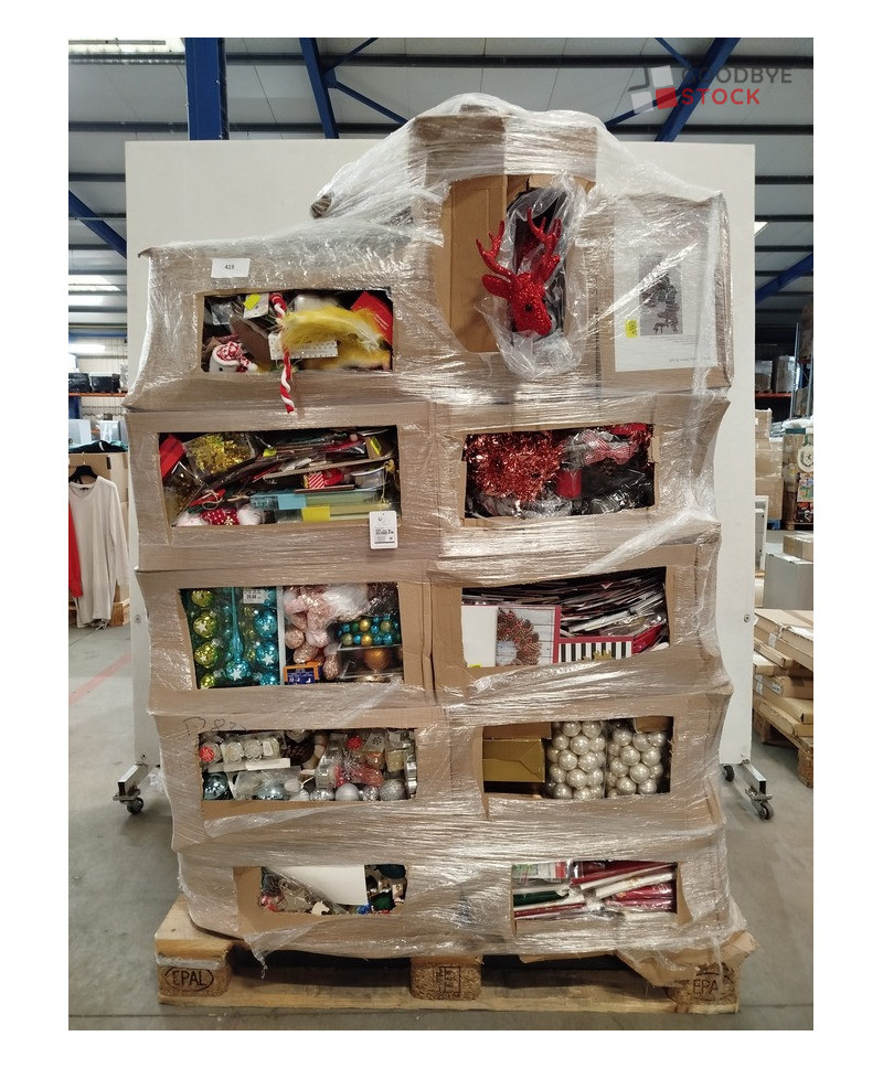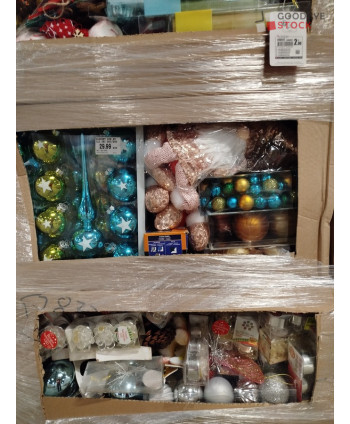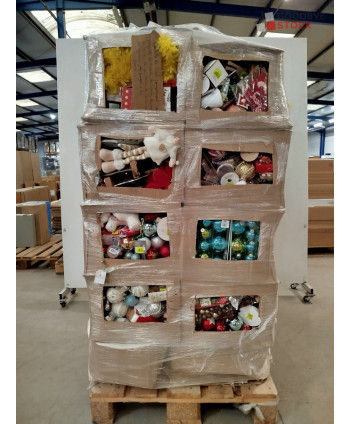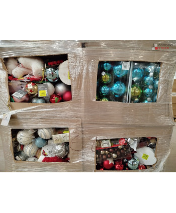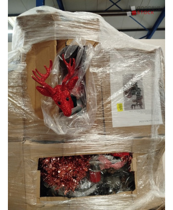 1 palette d'articles divers de Noël comprenant : des paquets de boules, des boules, des nappes de table, des gurilandes, des boîtes cadeaux, des gnomes, des bougies LED, etc - Lot de produits neufs pouvant contenir des produits endommagés et/ou cassés