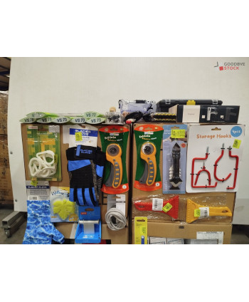 Lot de 4 cartons de bricolage comprenant : des paires de gants, des jeux de tournevis, des balais d'essui glace, des pinceaux etc..