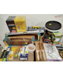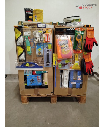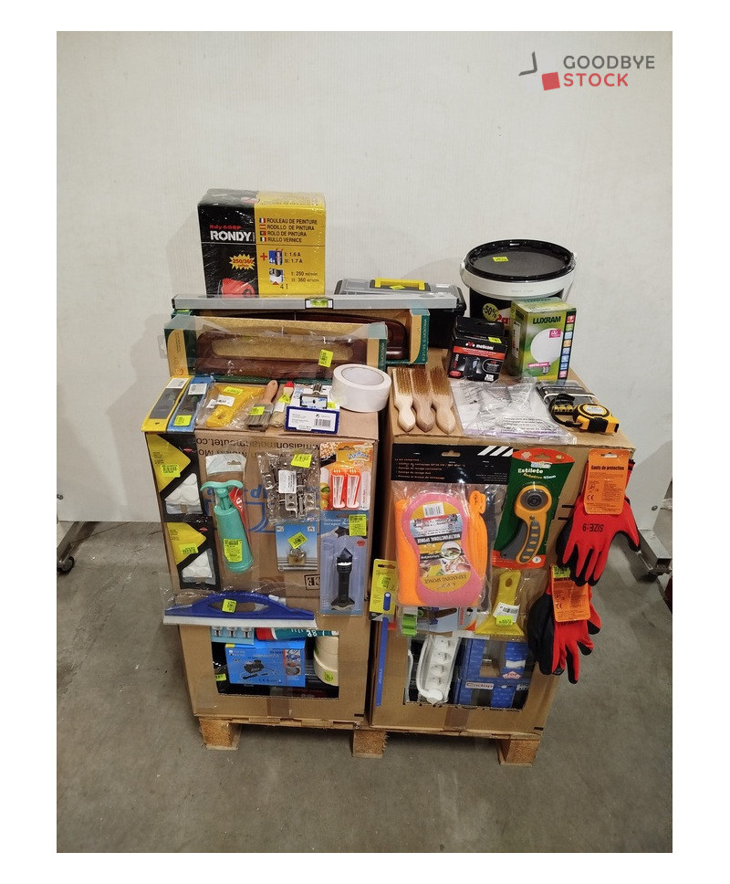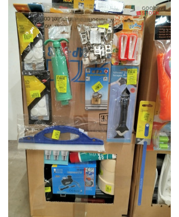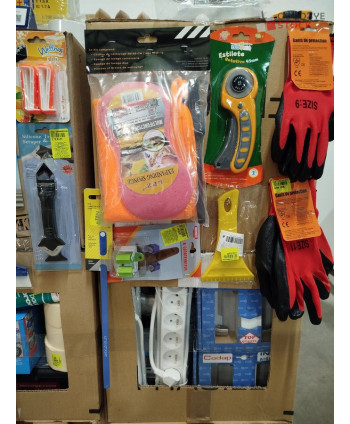 Lot de 4 cartons de bricolage comprenant : des multiprises, des gants, des patins, des brosses, des mètres, des ampoules, des accessoires automobiles...etc