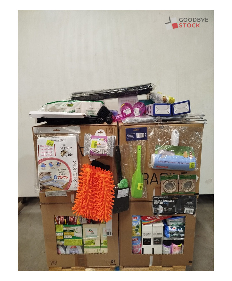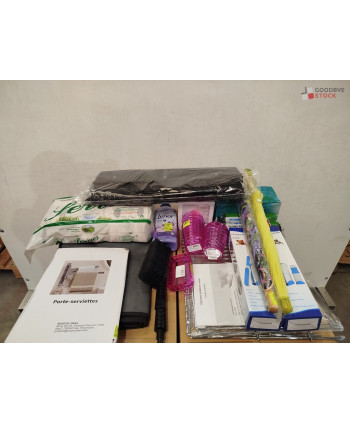 Lot de 4 cartons de produits et accessoires d'entretien comprenant : des porte-serviettes, papier wc, des gobelets, des éponges, des désodorisants, etc...