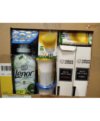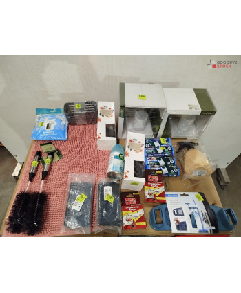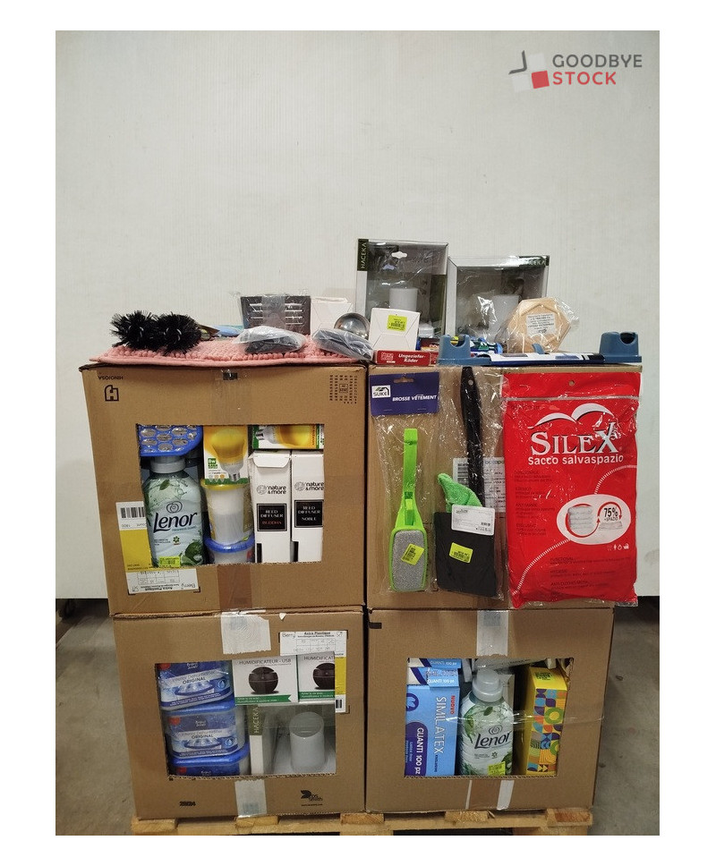 Lot de 4 cartons de produits et accessoires d'entretien comprenant : des accessoires de rangements, des adoucissants, des brosses pour biberons, des brosses vêtement, etc...