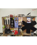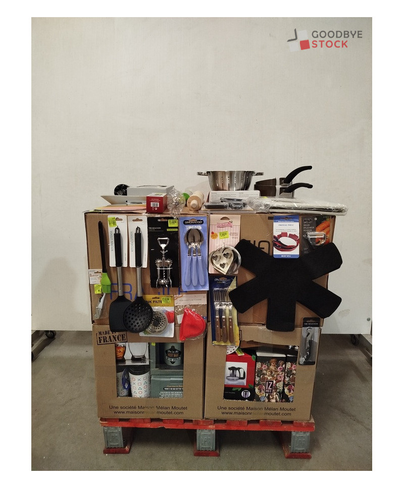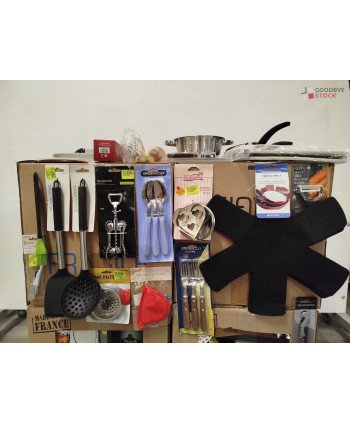 lot de 4 cartons de vaisselle et articles de cuisine comprenant: des ustensiles, des protèges poêles, des passoires etc..
