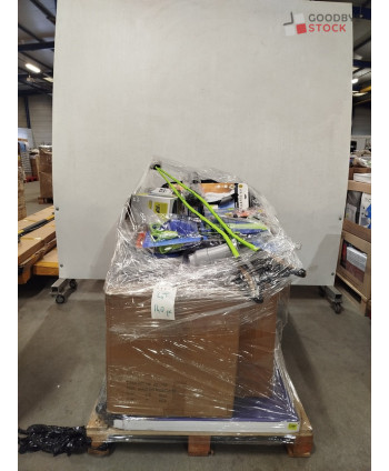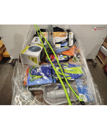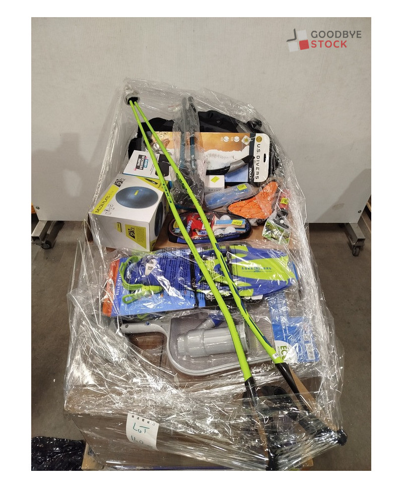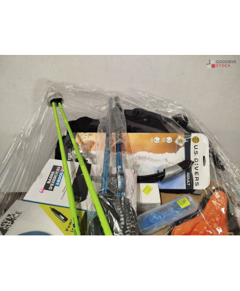 lot de 140 articles de sport comprenant: des ballons de pilate, des palmes, des bâtons de randonnée etc..