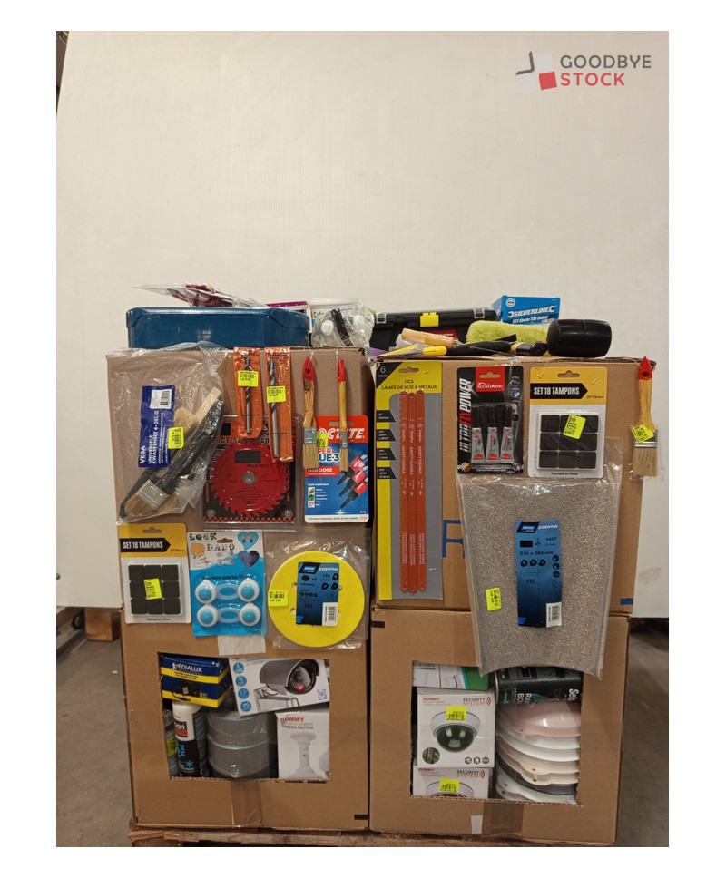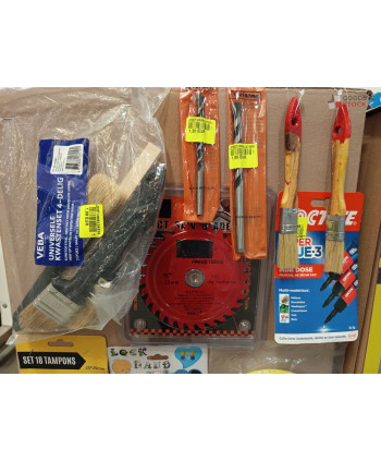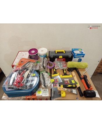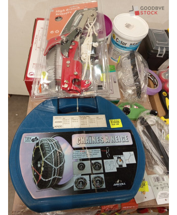 Lot de 4 cartons de bricolage comprenant : des pinceaux, des chaînes neige, des marteaux etc..