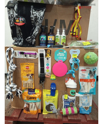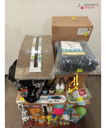 Lot de 200 articles d'animalerie comprenant: de la nourriture, des produits d'hygiène, des jouets...Etc