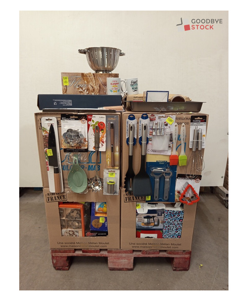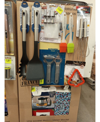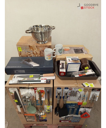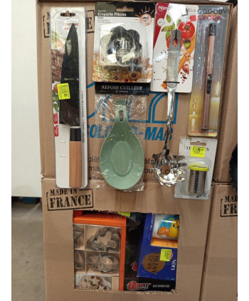 Lot de 4 cartons de vaisselle et articles de cuisine comprenant: des couteaux, des tasses, des plats, des passoires etc..