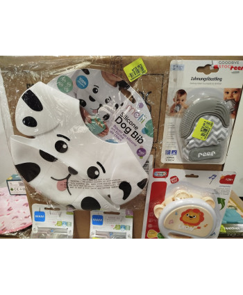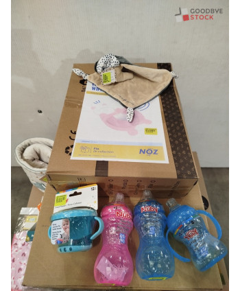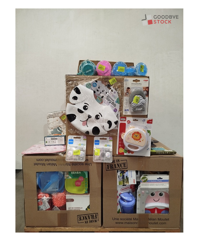 lot de 200 articles de puériculture comprenant: des accessoires pour le repas, des sucettes, des biberons, des jouets, des bavoirs...Etc