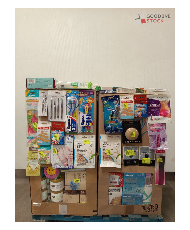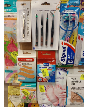 Lot de 4 cartons de produits d'hygiène corporelle comprenant : des brosses à cheveux, des soins, du shampoing, du gel douche, des pensements, des brosses à dents, du dentifrice, des brossettes, des lingettes...etc
