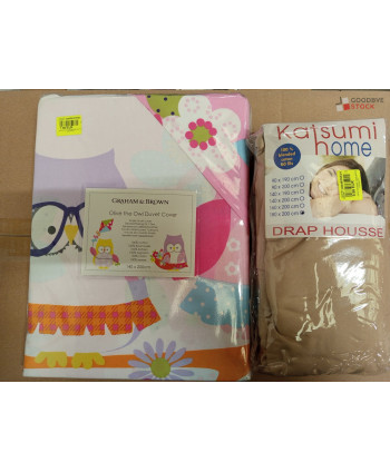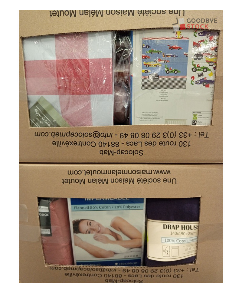 Lot de 60 pièces de linges de maison et linges de lit - linge emballés - comprenant : des nappes, des housses de couette, des rideaux, des draps housses...Etc