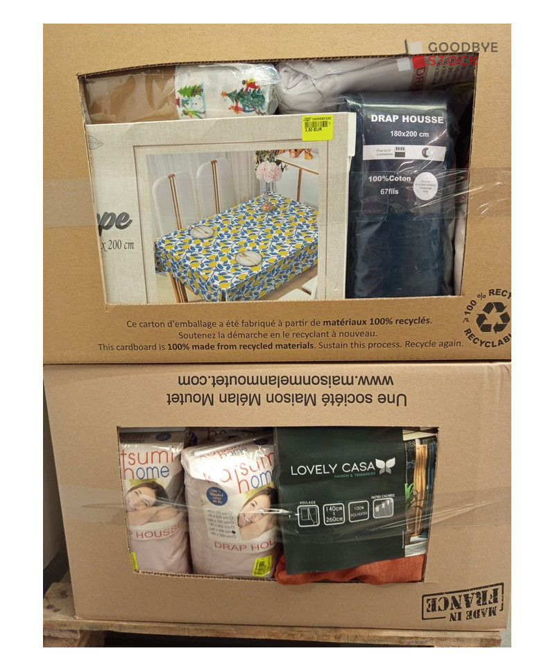 Lot de 60 pièces de linges de maison et linges de lit - linge emballés - comprenant : des nappes, des housses de couette, des rideaux, des draps housses...Etc