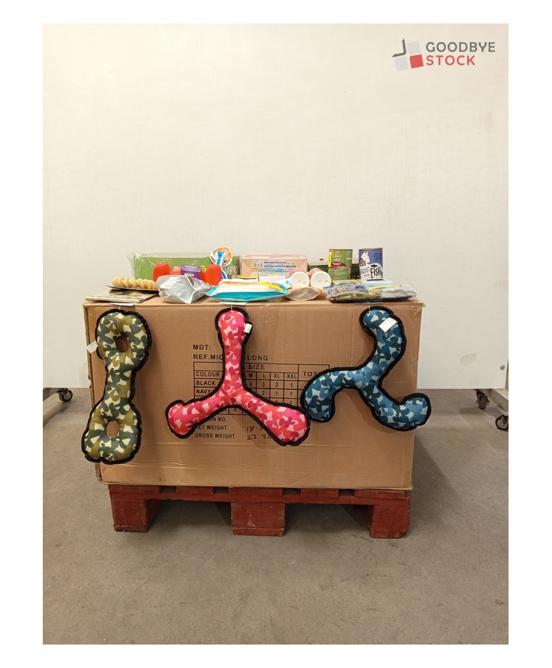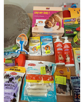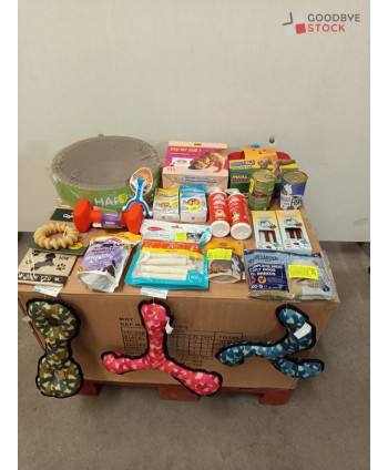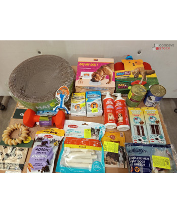 Lot de 200 articles d'animalerie comprenant: de la nourriture, des produits d'hygiène, des jouets...Etc