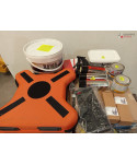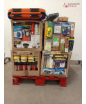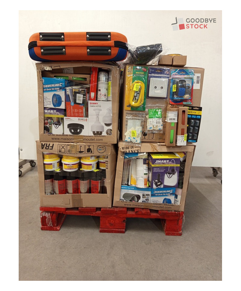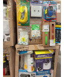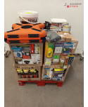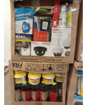 Lot de 4 cartons de bricolage comprenant : des caméras, des pots de peinture, des multiprises, des lampes, etc...