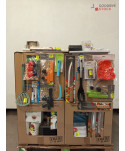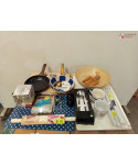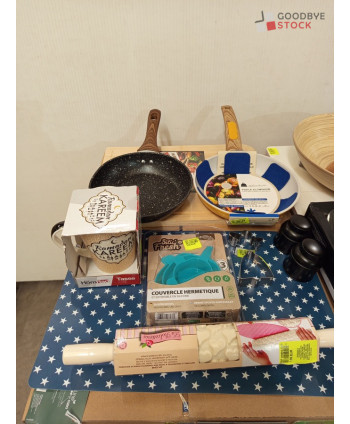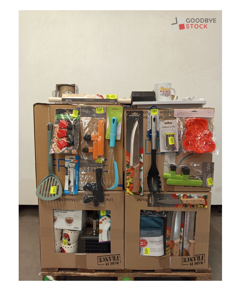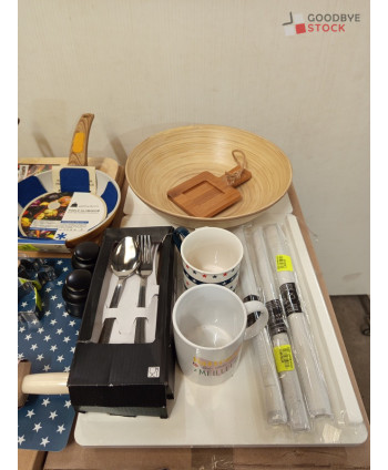 Lot de 4 cartons de vaisselle et articles de cuisine comprenant: des ustensiles, des planches à découper, des couteaux, des tasses, des pinces à sac, etc...