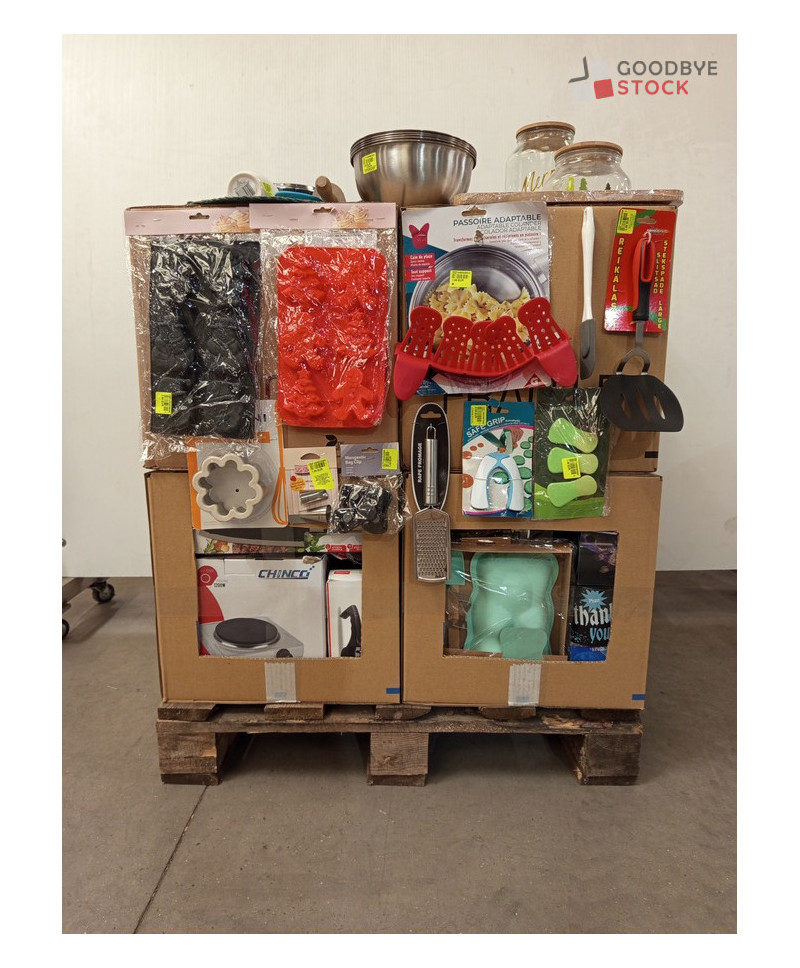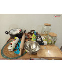 Lot de 4 cartons de vaisselle et articles de cuisine comprenant: des ustensiles, des planches à découper, des tasses, des moules à gâteaux, des sets de table, etc...