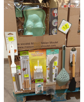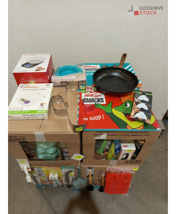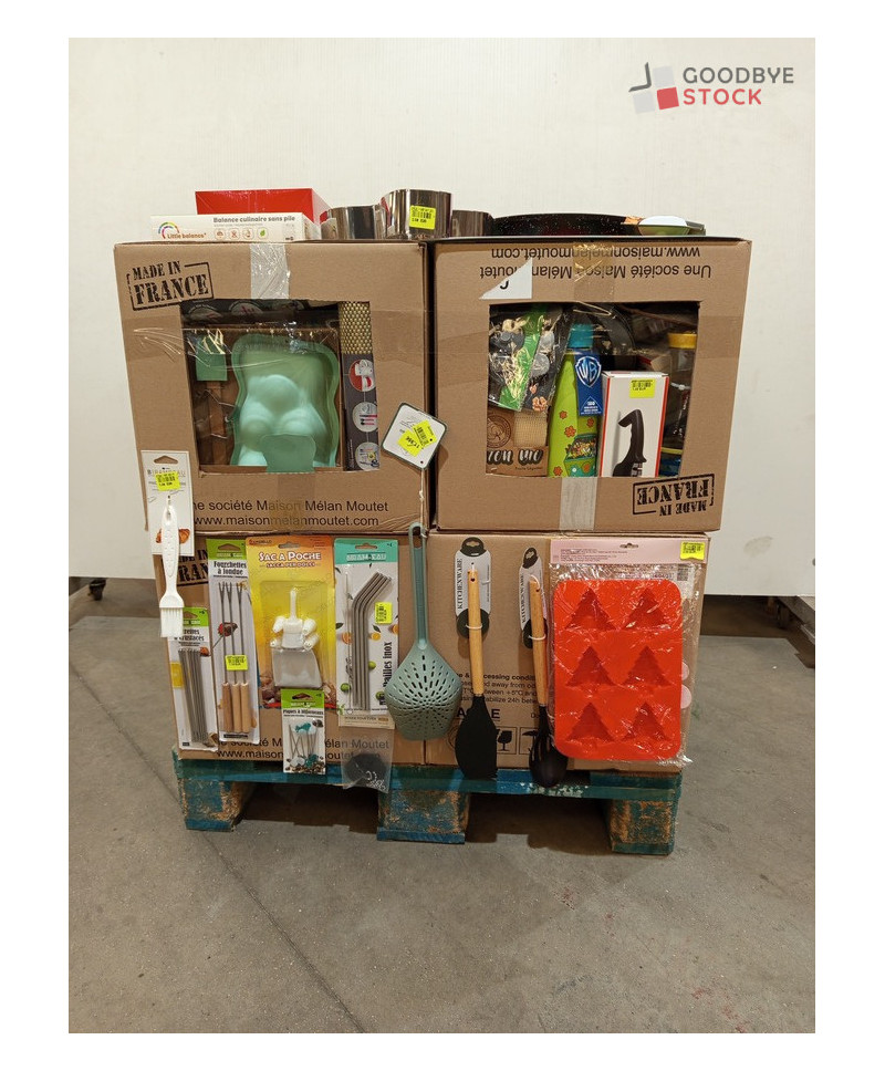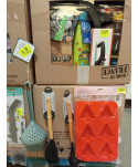 Lot de 4 cartons de vaisselle et articles de cuisine comprenant: des ustensiles, des sacs de poche, des moules à gâteaux, des sets de table, des pailles etc...