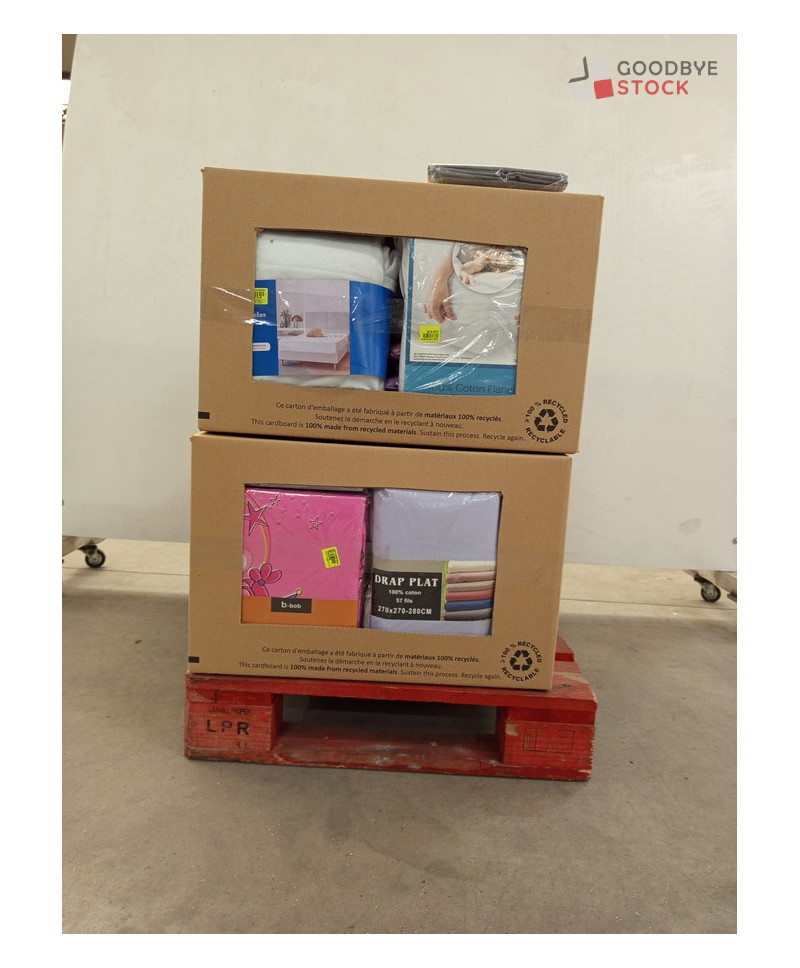 Lot de 60 pièces linges de lit - linge emballés - comprenant : des draps plats, des housses de couette, des taies d'oreillers, des rideaux...etc